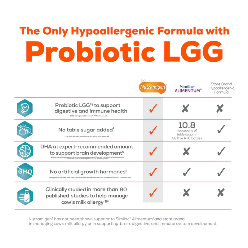 Enfamil Nutramigen Powder with Enflora LGG is a hypoallergenic infant formula designed for babies with cow’s milk protein allergy or sensitivity. It features extensively hydrolyzed proteins for easier digestion and includes the probiotic Enflora LGG to help support digestive and immune health, while providing complete nutrition for infants.